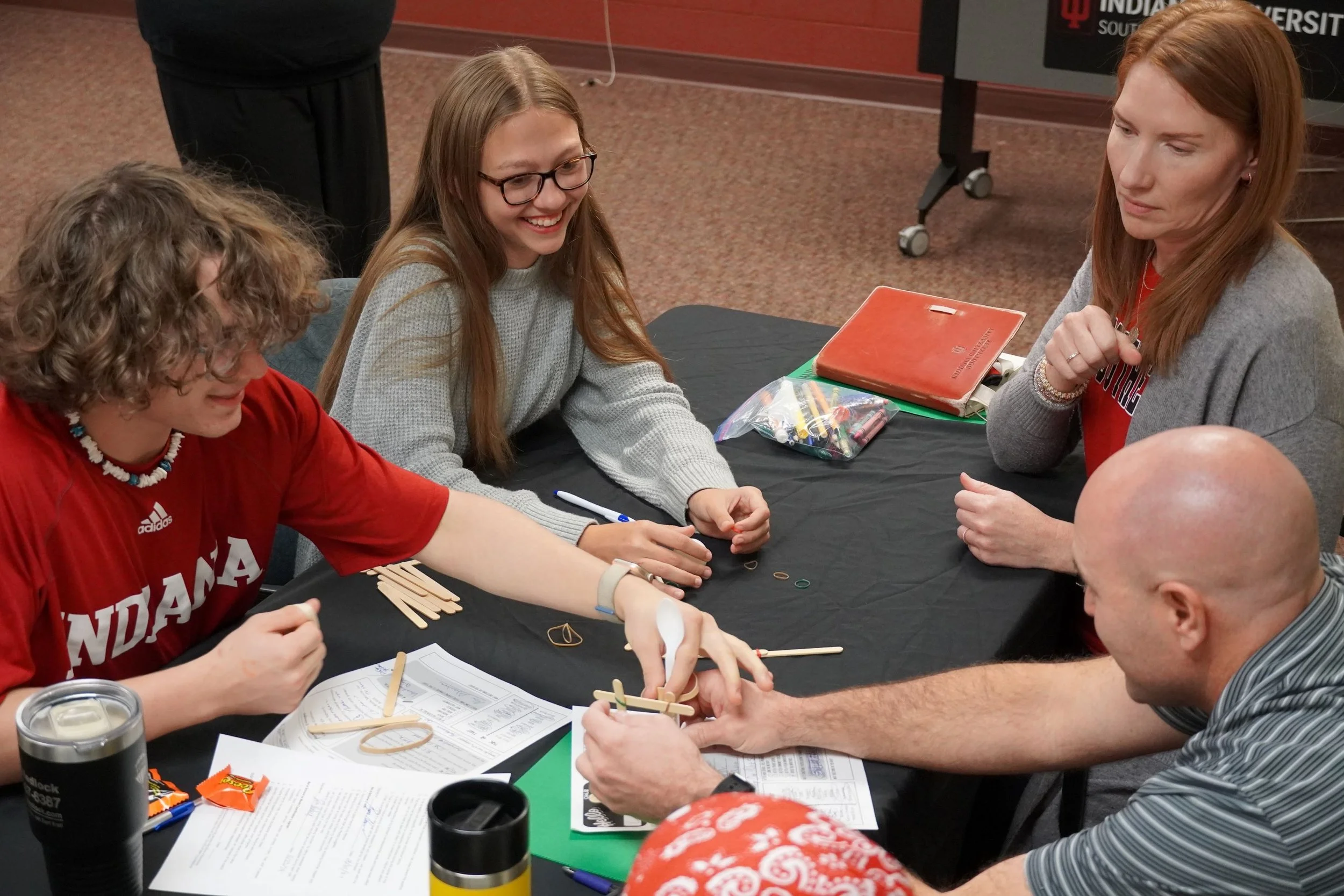 Clarksville High School students and IU Southeast faculty work together to build a catapult out of popsicle sticks, rubber bands, and spoons.